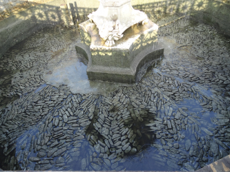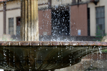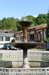 Auf der Hütte wurde der Brunnen in einzelnen Segmenten gegossen, also das Gitter, die Säulen und die Schalen. Anschließend setzten Fachleute alles meisterhaft zusammen. Bei klarem Wasser kann man die zur Säule hin laufende Steinsetzung des Brunnenbodens erkennen.