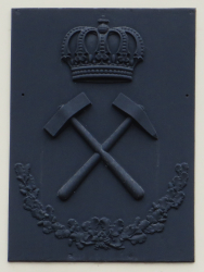 Über dem Haupteingang erkennt man das Geschäftszeichen der Königshütte: Schlägel und Eisen, umgeben von Eichenlaub und oben von einer Königskrone begrenzt.